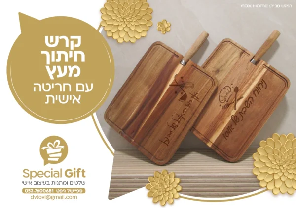 קרש חיתוך מעץ כולל סכין בתוספת חריטה מרשימה